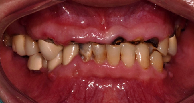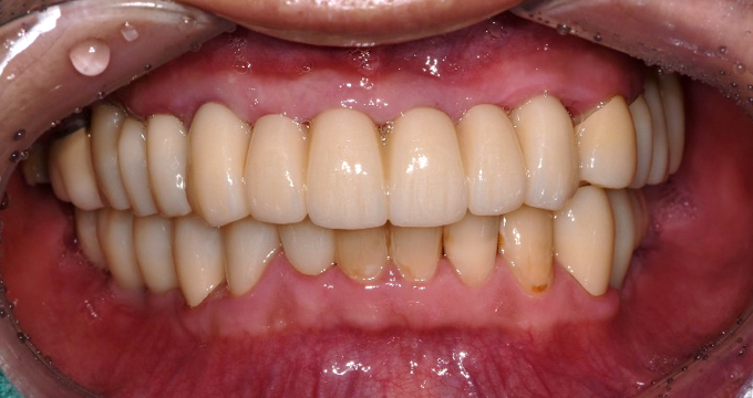 40대 남성 환자분으로, 위 아래 치아들이 전체적으로 망가짐에 따라 얼굴의 '수직고경'이라고 하는 하안면의 높이가 줄어들어 있었습니다.